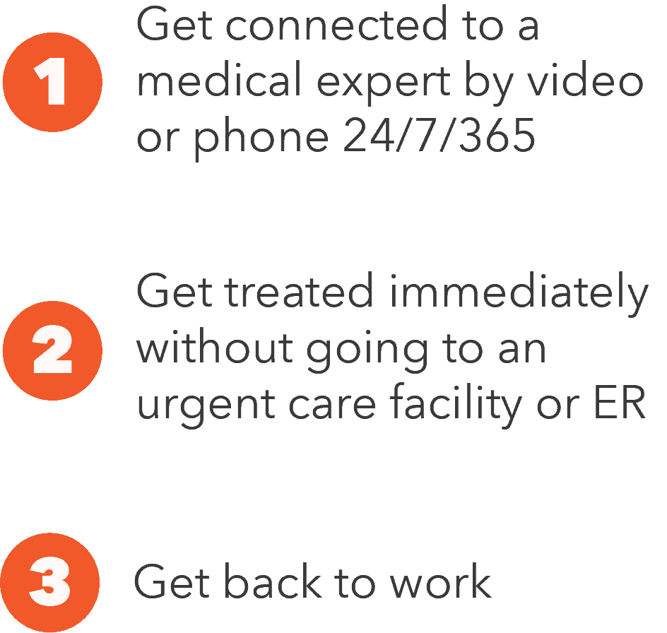 When work matters, provide your team direct access 24/7/365 to licensed injury care experts from anywhere by phone or video.